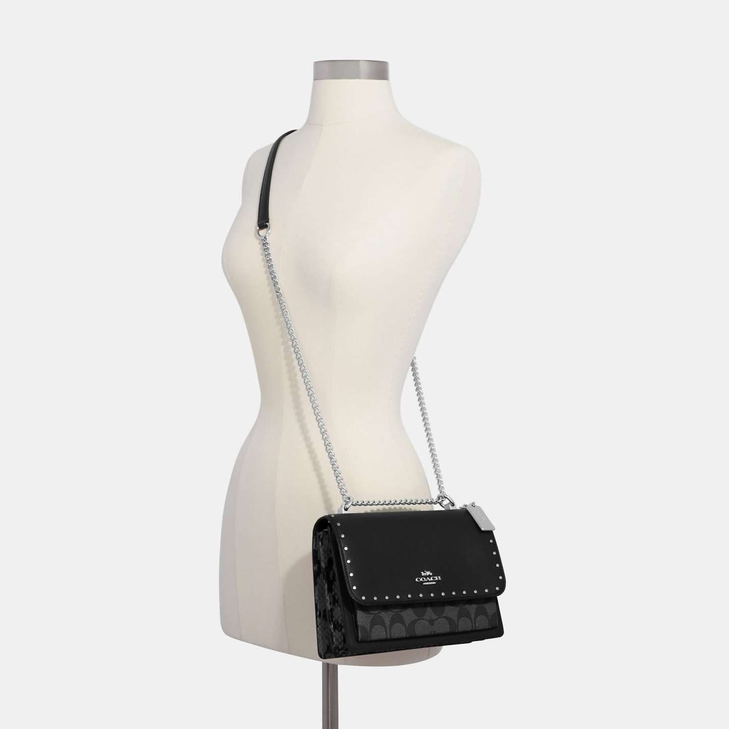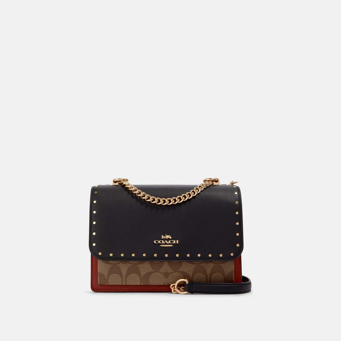 Smooth leather Signature coated canvas and snake-embossed leather Inside zip and multifunction pockets Snap closure fabric lining Outside slip pocket Strap with 22 drop doubles up for three ways to wear - short or long on the shoulder or crossbody style 8 1/2 (L) x 6 1/4 (H) x 2 3/4 (W) Style No. 90400 | Outlet Klare Crossbody In Signature Canvas With Rivets - Black
