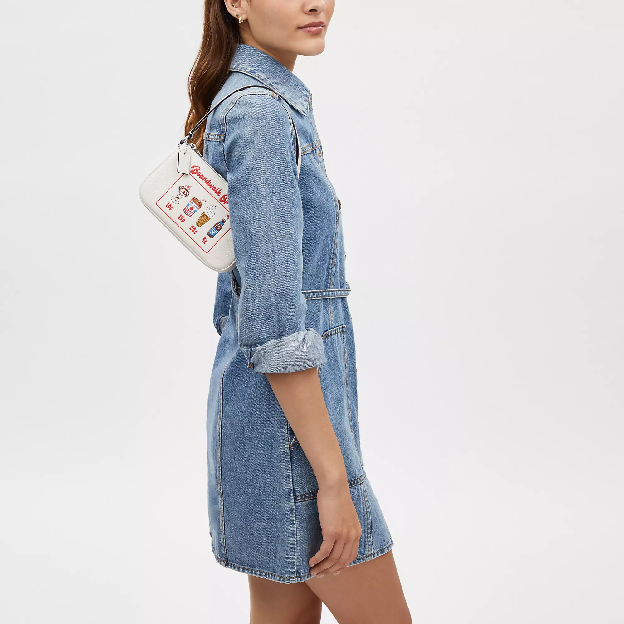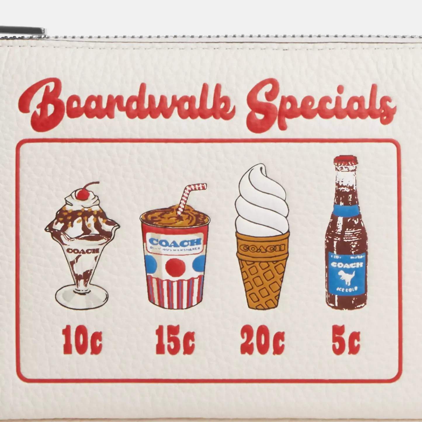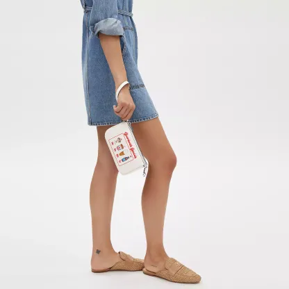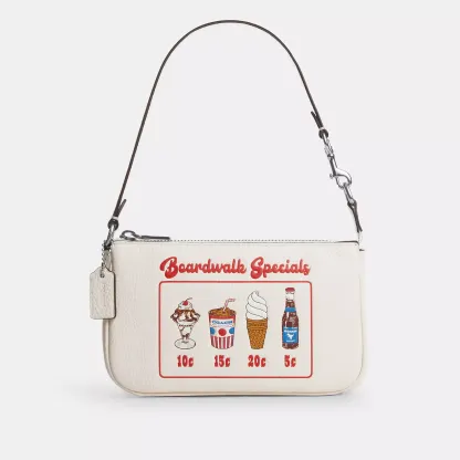Refined pebble leather Two credit card slots Zip-top closure fabric lining Handle with 6 1/4 drop 7 1/2 (L) x 4 1/2 (H) x 2 (W) Style No. CU197 | Outlet Nolita 19 With Boardwalk Graphic - White