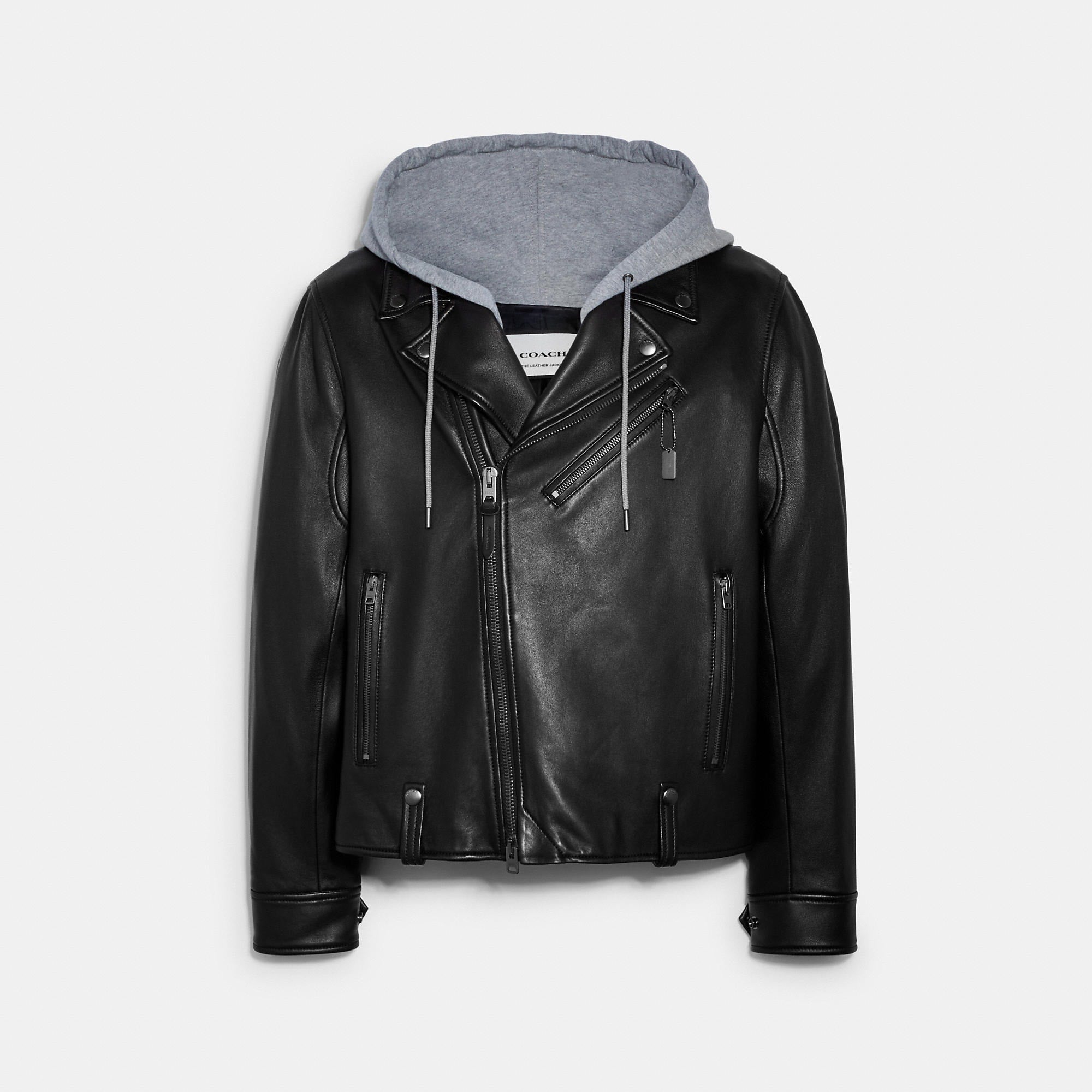 100% lamb leather Lining - 56% polyester 44% viscose Hood - 100% cotton Zip closure Zip pockets Length - 23 3/4 Model is 6'2 (188cm) and wears a size M Style No. C7839 | Outlet Leather Moto Jacket - Black, Size - Medium