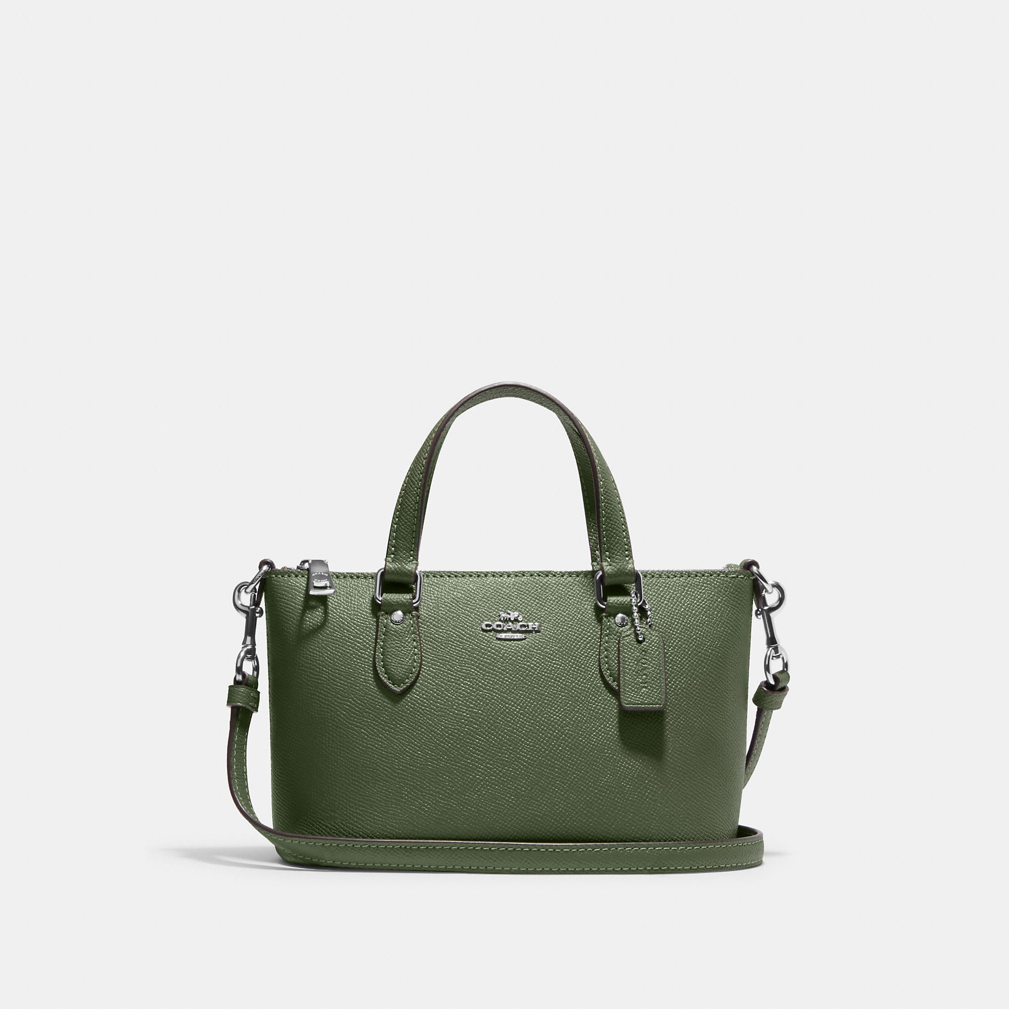 Crossgrain leather Two credit card slots Zip-top closure fabric lining Handles with 3 drop Detachable strap with 23 1/2 drop for shoulder or crossbody wear 7 1/4 (L) x 5 (H) x 3 1/2 (W) Style No. CH198 | Outlet Mini Gallery Crossbody - Black
