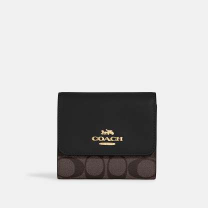 Signature coated canvas and smooth leather Two credit card slots Full-length bill compartment ID window Zip coin pocket Snap closure Outside open pocket 4 1/4 (L) x 4 (H) Style No. CE930 | Outlet Small Trifold Wallet In Blocked Signature Canvas - Black
