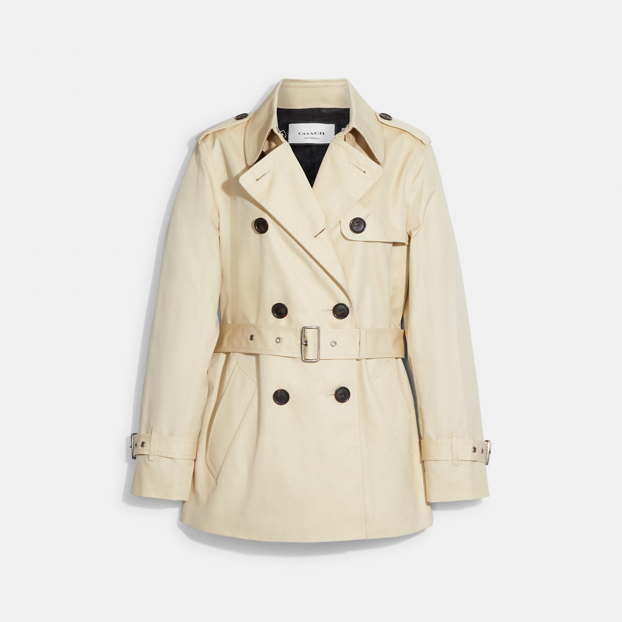 68% cotton 32% polyester Lining - 58% polyester 42% viscose Button closure Slip pockets Adjustable belt Water-resistant Length - 28 1/4 Model is 5'10 (178cm) chest 31 (79cm) waist 24 (61cm) hips 35 (89cm) and wears a size S Style No. CG042 | Outlet Solid Short Trench - Beige, Size - Medium